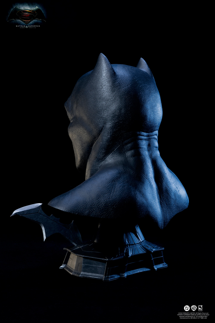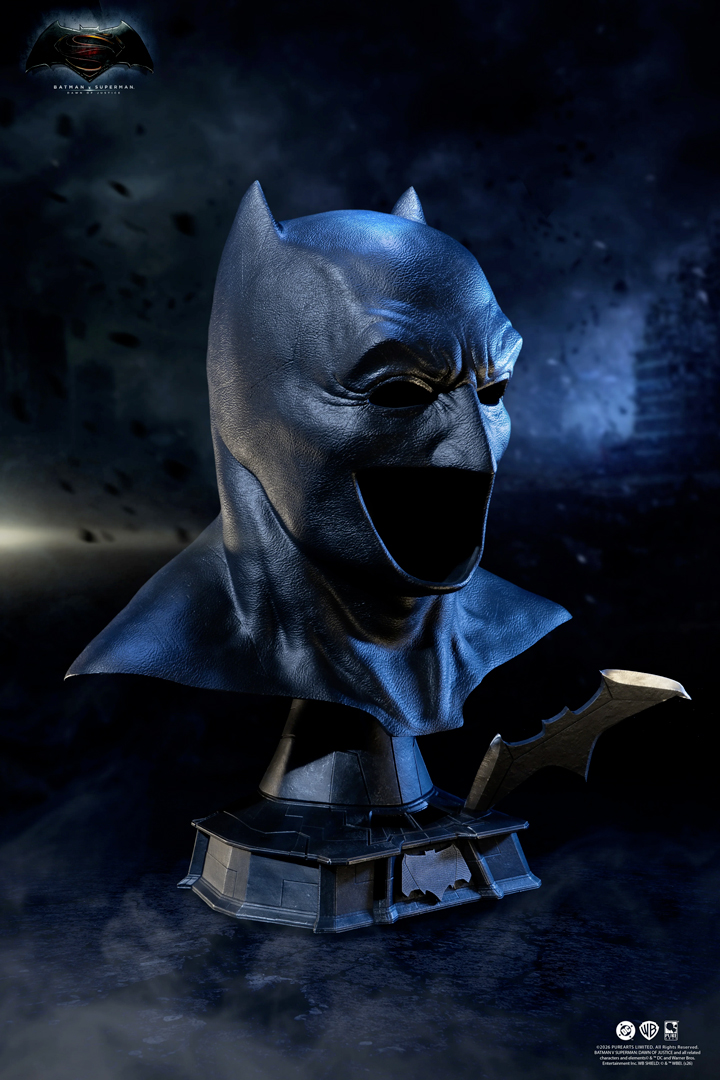 PureArts a reproduit le masque à l’échelle 1/1 en utilisant son matériau composite flexible poly-hybride exclusif, développé spécifiquement pour leurs répliques Batman. Résultat : un rendu visuel et tactile au plus près de l’accessoire original du film, des lignes rigides de la cagoule à l’expression sévère qui a marqué les esprits en 2016.